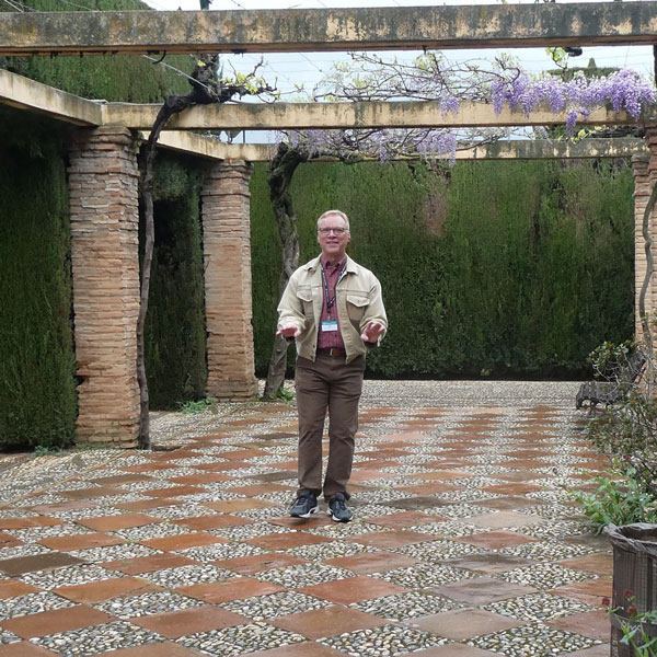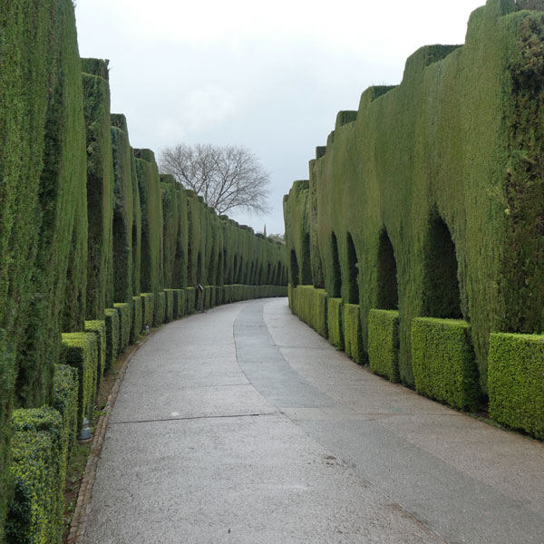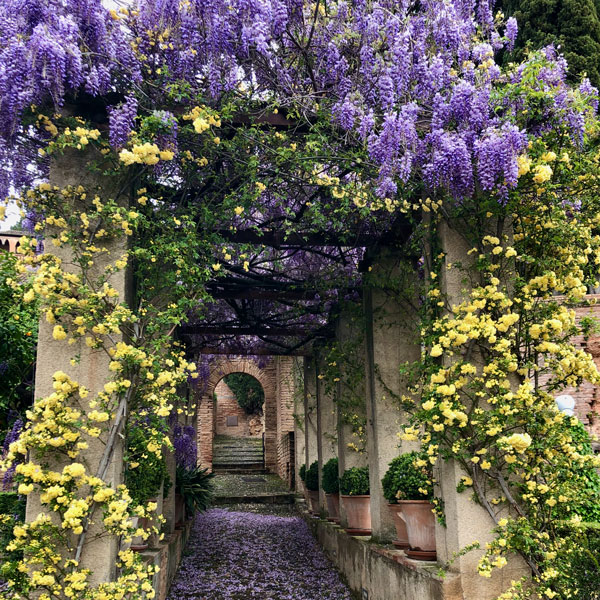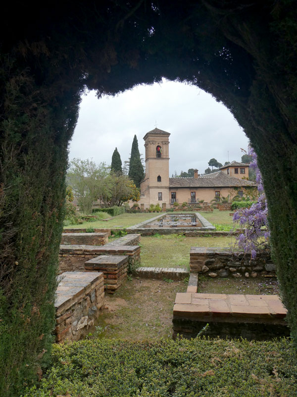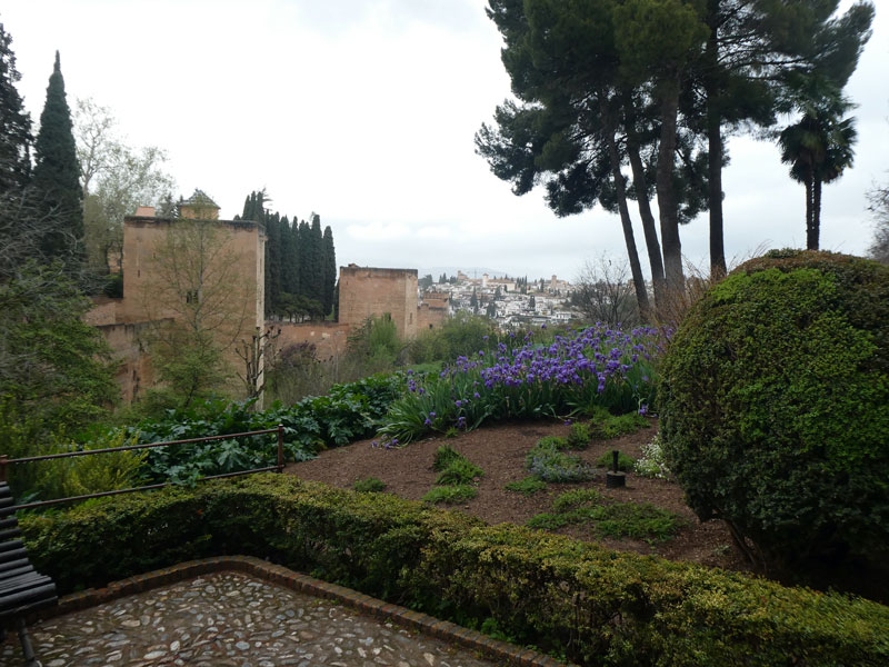 After a drive up…up…up to the hilltop location, we entered the grounds down a long walkway flanked with sculpted shrubbery. Through the arches, we caught glimpses of different Alhambra structures, both Moorish and Christian, as we continued past floral gardens already blooming with spring flowers.